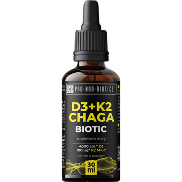 Suplement diety w kroplach, z witaminami D3, K2 MK-7, ekstraktem chagi i siedmioma szczepami pożytecznych bakterii. Produkt rekomendowany dla osób dorosłych.